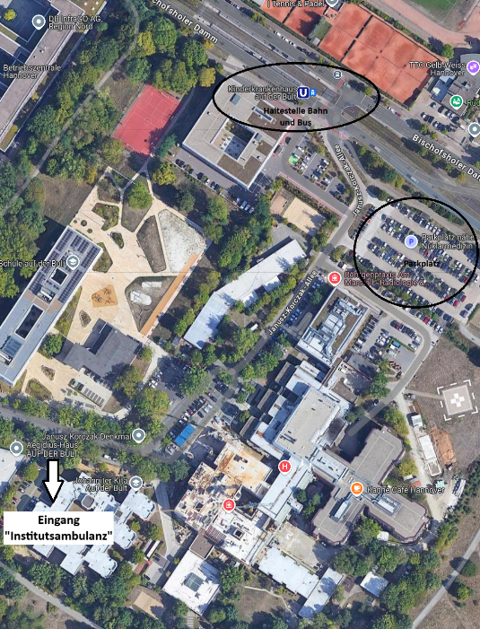 Nehmen Sie die U-Bahn Linie 6 (oder den Bus Linie 800) bis zur Haltestelle "Kindkrankenhaus auf der Bult".